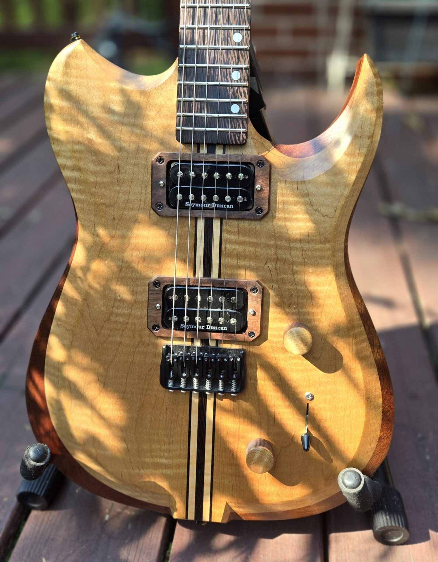 Handcrafted 6-string solid body electric guitar – roasted maple top, mahogany back, Seymour Duncan pickups, wenge fretboard, and stainless steel frets.